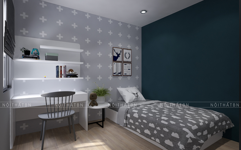 Phòng trẻ em tích hợp bàn học, tiện dụng cho trẻ học tập và nghỉ ngơi.