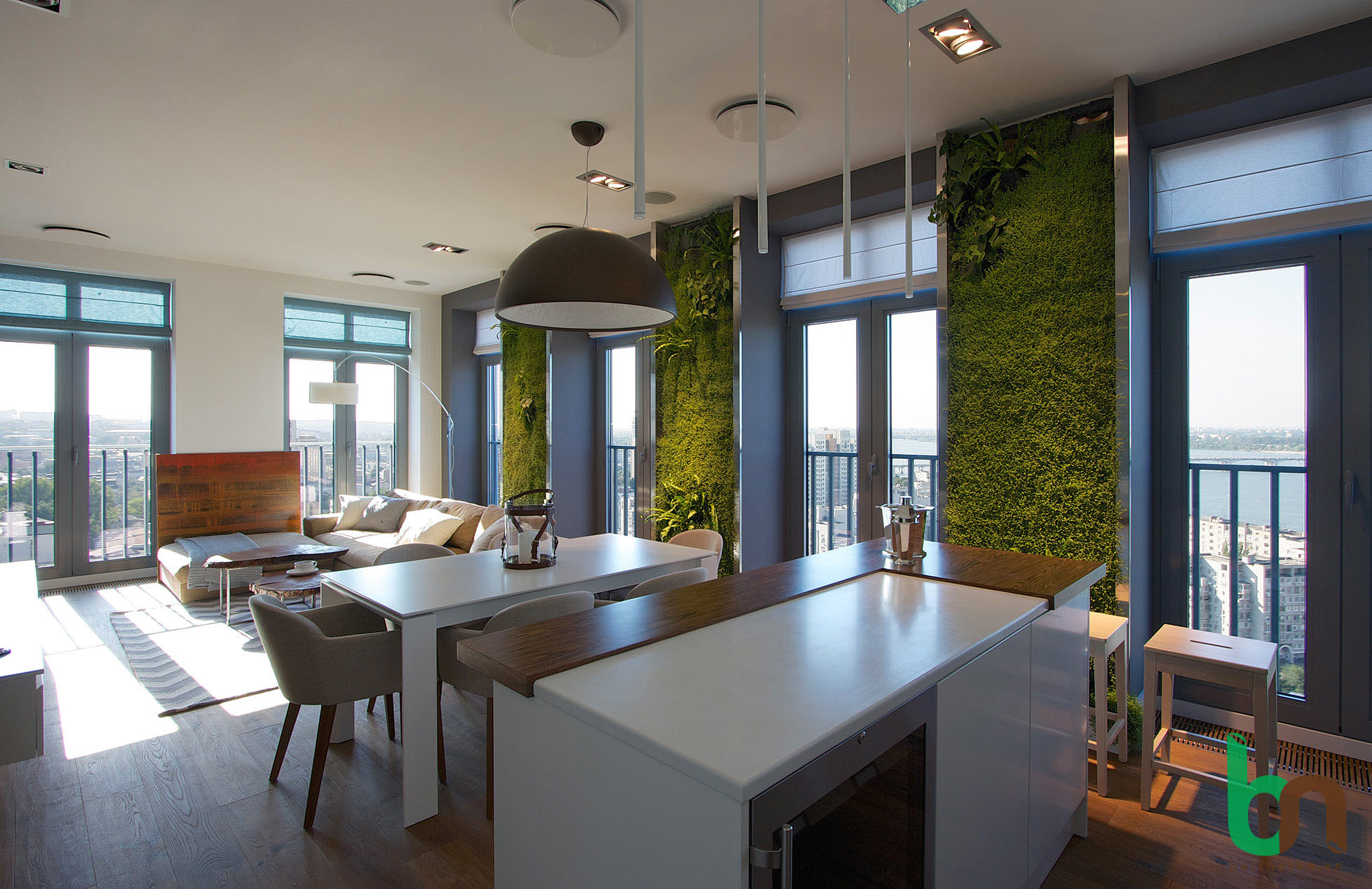 Với lối bài trí tinh gọn cùng sự tối ưu hóa công năng nổi trội của phong cách hiện đại. Tổng thể căn hộ là sự hòa quyện tươi tắn với những gam màu sáng của sự kết hợp giữa mảng tường trắng cùng với những vật dụng nội thất tone nâu và cam nhạt đã sáng tạo nên một bức tranh tràn đầy sức sống. Hơn hết, những mảng cây xanh được trang trí tạo điểm nhấn và mang lại cảm giác thoáng đãng, thoải mái.